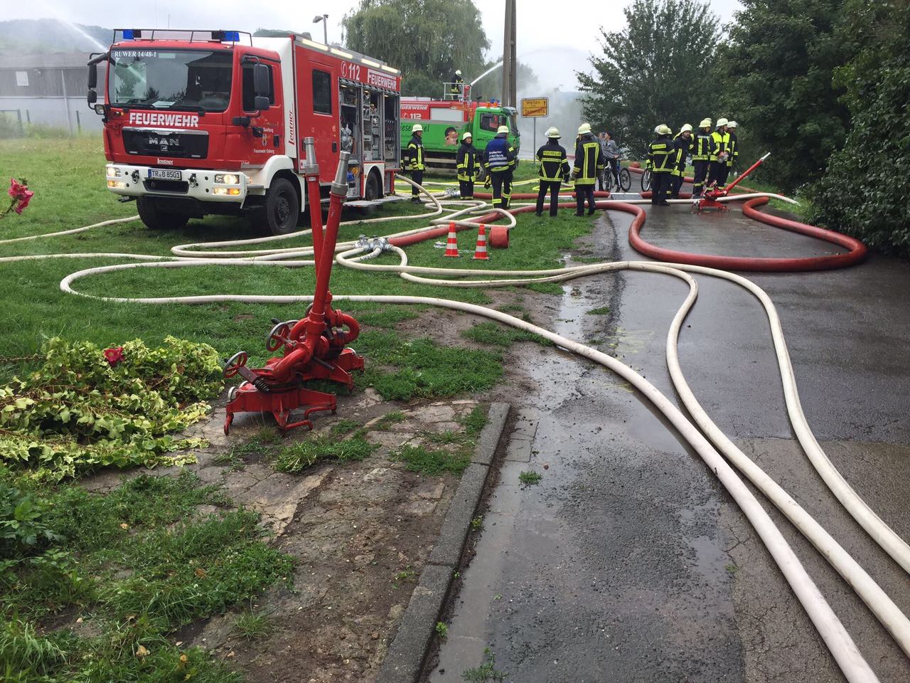Unsere Aufgabe bestand darin eine Wasserversorgung aus der Mosel in Zusammenarbeit mit den Wehren aus Wellen und Nittel aufzubauen, die dazu diente ein Tanklöschfahrzeug mit Dachmonitor und einen tragbaren Wasserwerfer einzuspeisen.