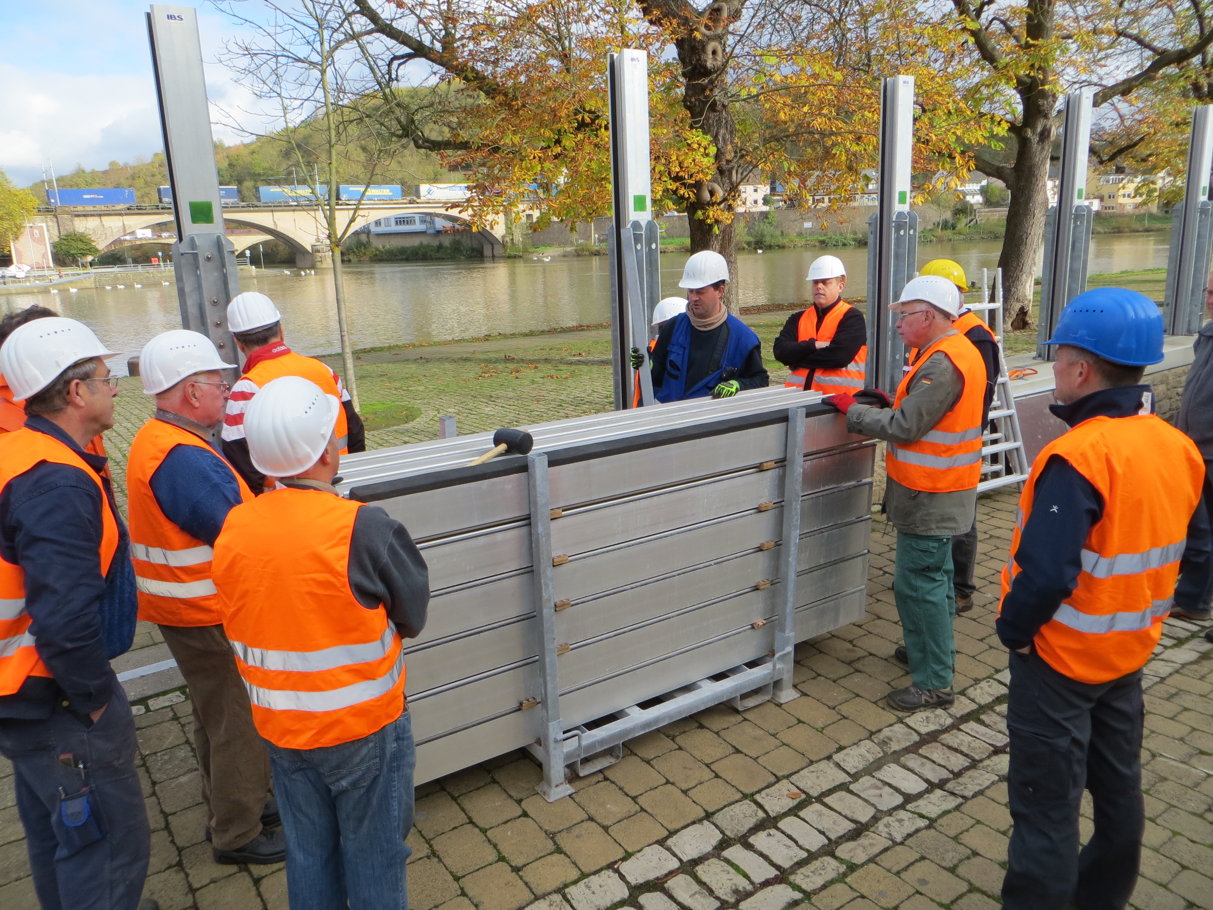 Am Samstag, 8. November, hat die Feuerwehr und die Wasserwehr den ersten Teil des Hochwasserschutzes in Oberbillig aufgebaut. Einsatzbeginn war 8 Uhr, Einsatzende um 13 Uhr. Im Einsatz waren 9 Mann der Feuerwehr und 13 Mann der Wasserwehr, sowie der Gemeindediener mit Traktor. Zudem kamen 3 Gabelstapler zum Einsatz. Auch der Bauhof der Verbandsgemeinde war mit LKW am Aufbau beteiligt. Im Rahmen des Aufbaus wurde die Wasserwehr zum weiteren Vorgehen der Aufbaustufen 2 und 3 unterwiesen.